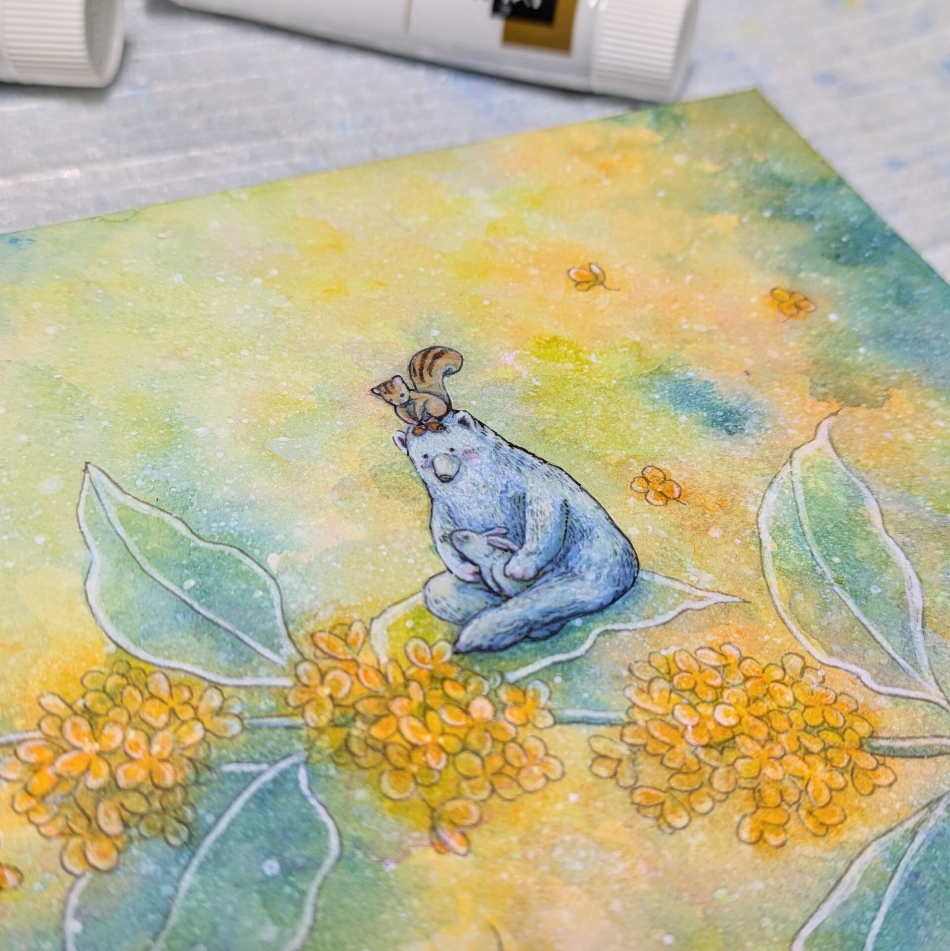 シロクマと白うさぎとリスという現実ではありえない取り合わせです。