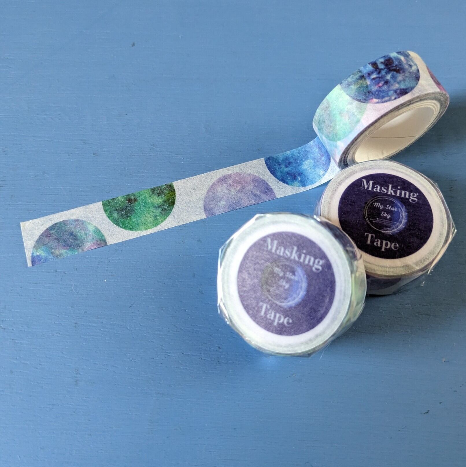 丸く切り取ったカラフルな星空をいくつか集めてマスキングテープにしました。